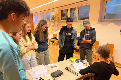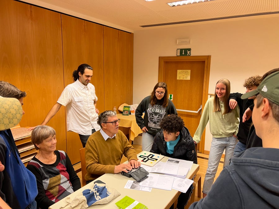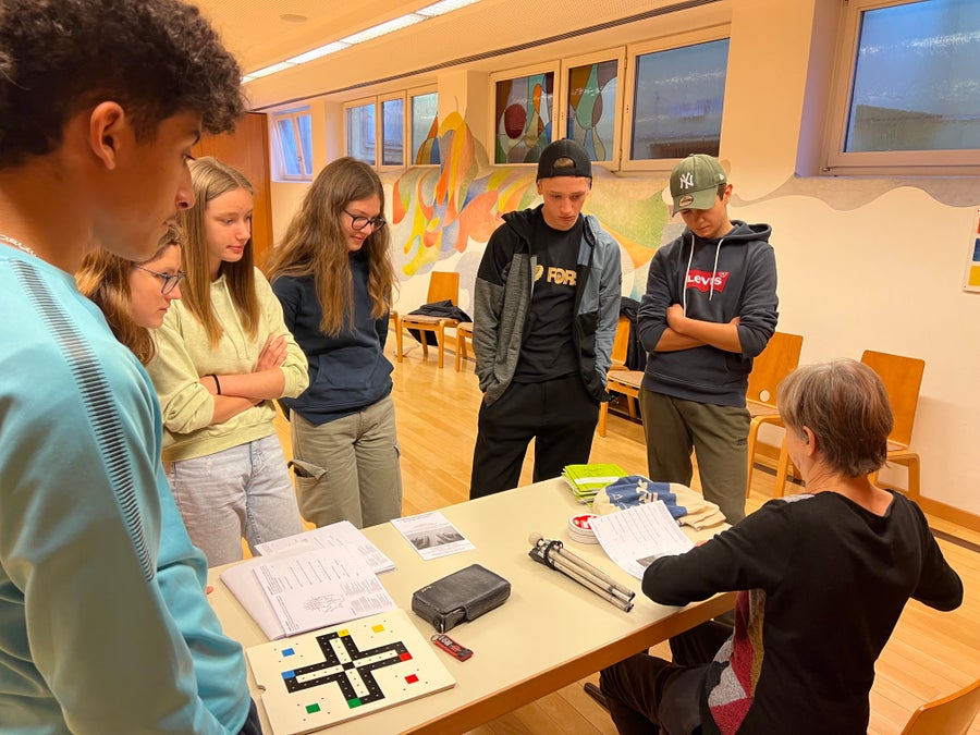 Filo erklärte, wie man die Blindenschrift mit einer Schablone schreibt und stellte weitere Hilfsmittel eines blinden Menschen vor.