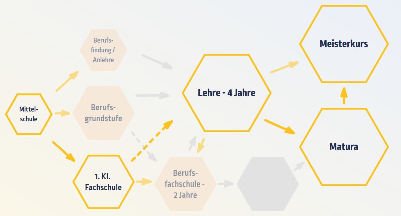 Nach dem Abschluss einer der 1. Klassen folgen zwei Ausbildungsjahre inklusive Praktikum und anschließender Fachprüfung. Du erhältst ein Fachdiplom in der entsprechenden Fachrichtung. Darauf bauen weitere Spezialisierungen und die Möglichkeit der Matura auf.